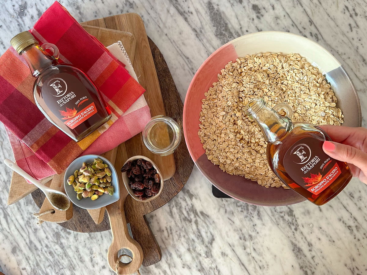La nostra gragnola fatta in casa con Sciroppo d’Acero Fattoria dei Sapori è il mix perfetto per tornare a colazioni sane, naturali e piene di energia. Croccante, dorata e naturalmente dolce, grazie al nostro sciroppo d’acero 100% puro: nessun conservante, solo aroma autentico.