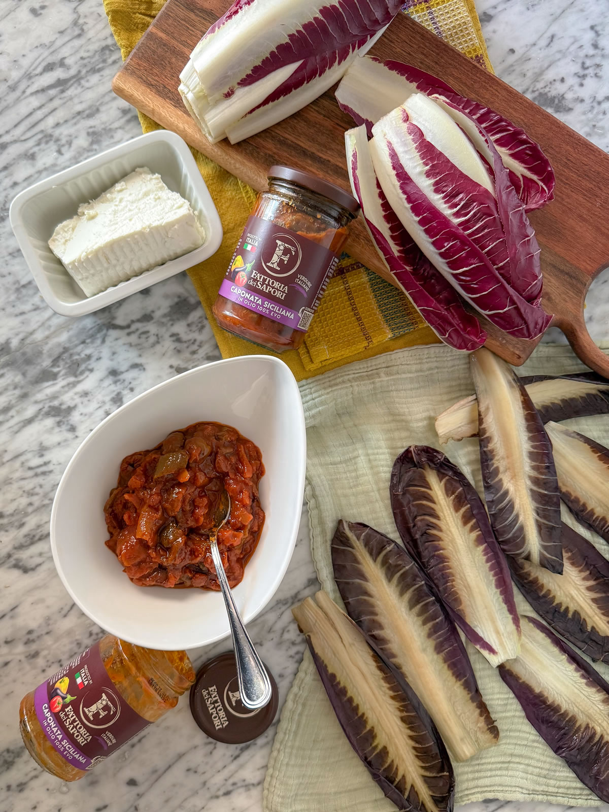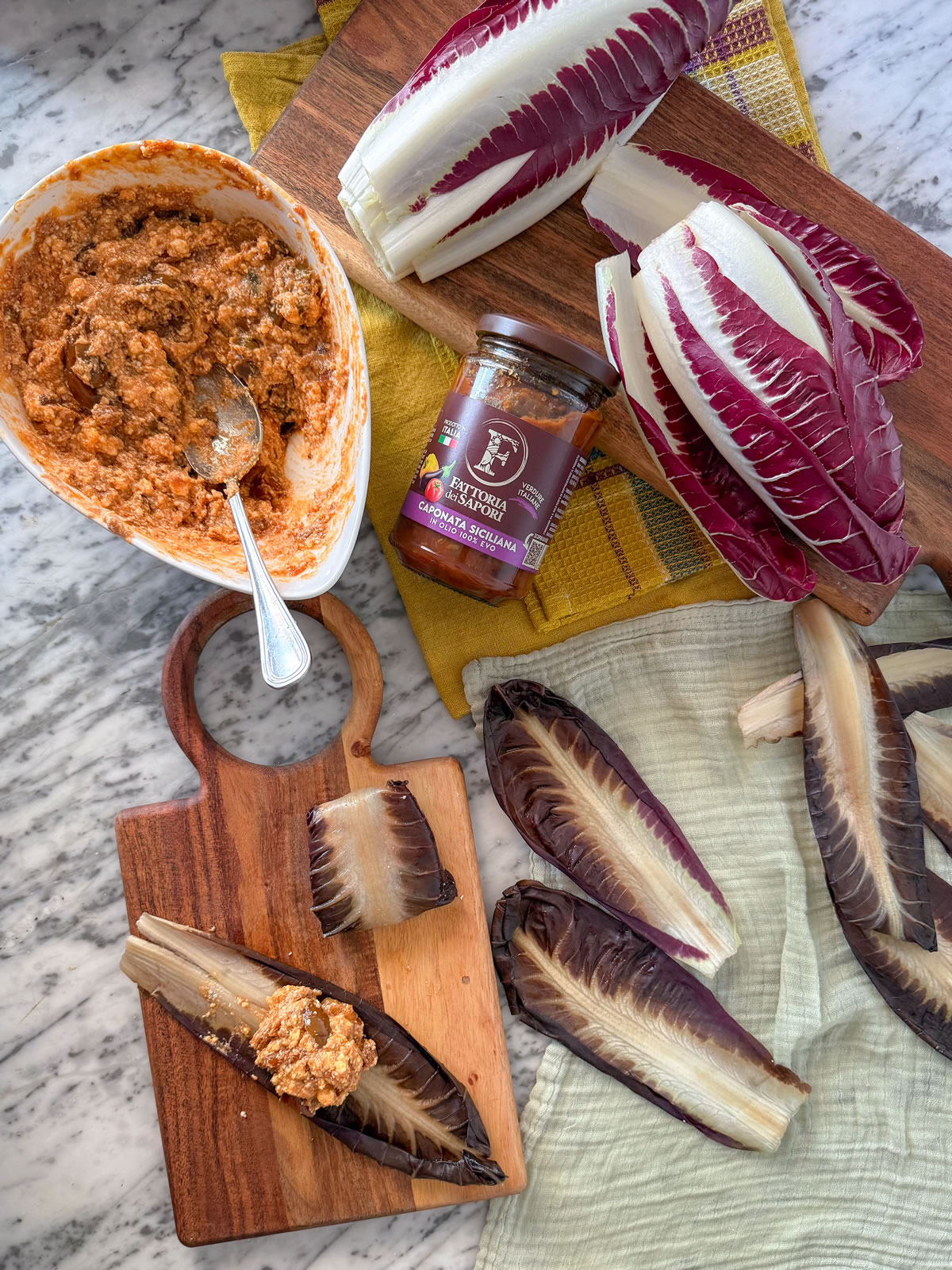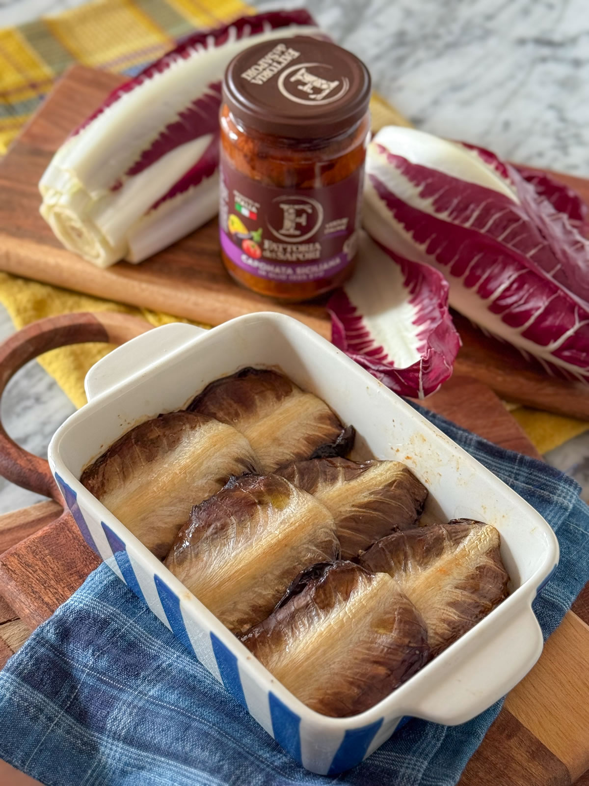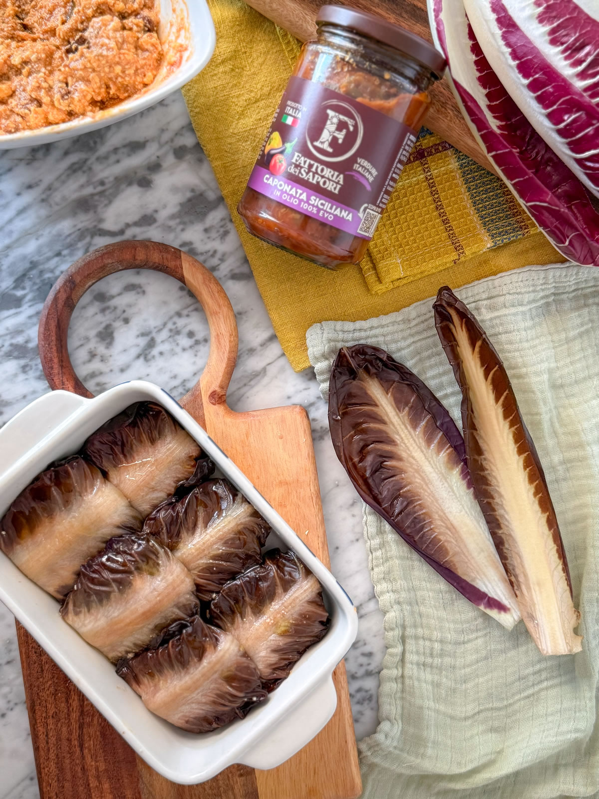Le foglie di radicchio diventano l’involucro perfetto per accogliere un ripieno morbido di Caponata Siciliana e ricotta, da cuocere in forno per un risultato che conquista.