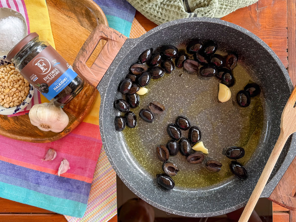 Aggiungere le olive prima, metà dei pinoli poi e saltare brevemente;